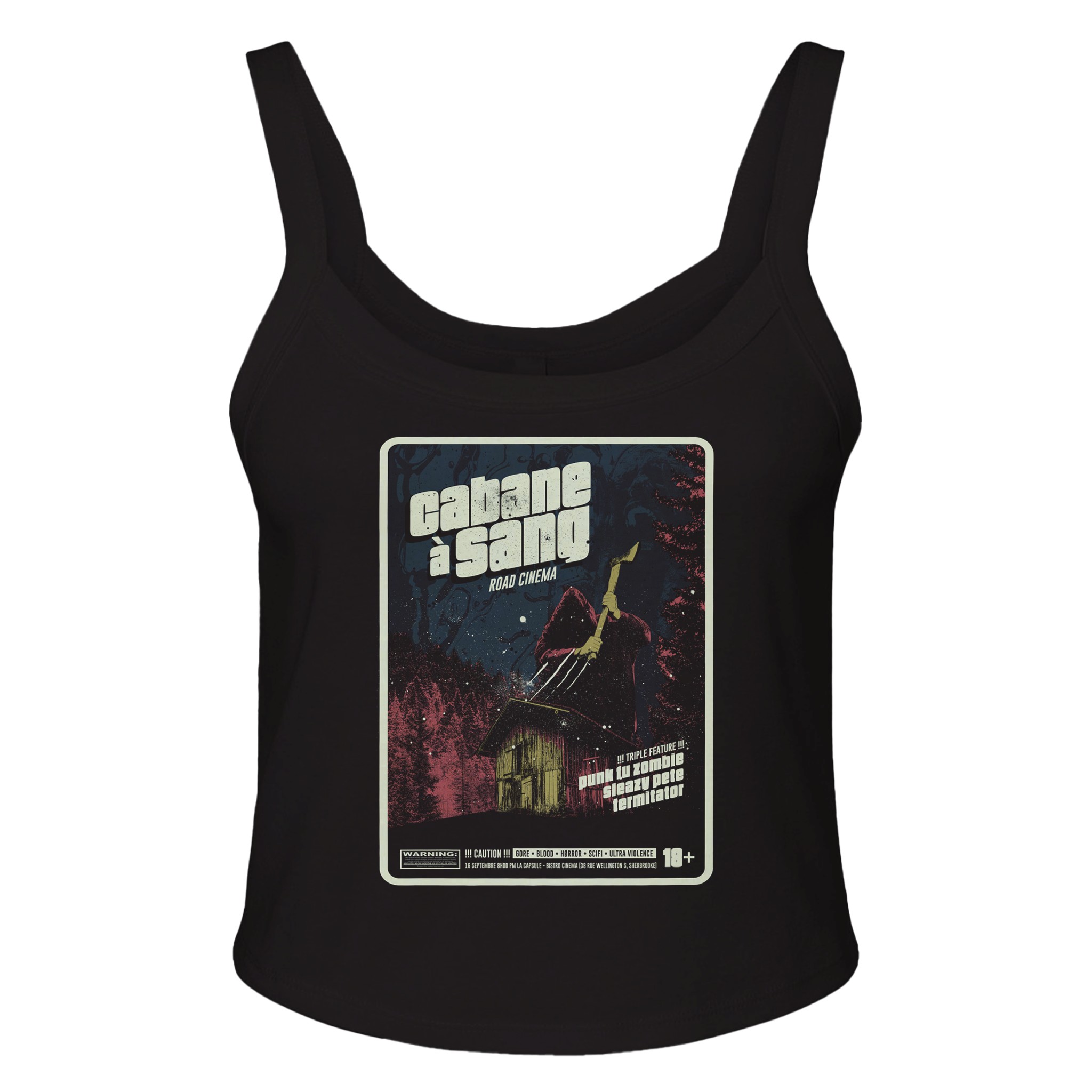 Own a piece of horror history with this official Cabane à Sang 1st Edition women’s tank top, celebrating the debut year of Quebec’s bloodiest underground film festival. A collectible for die-hard fans and a stylish nod to the roots of alternative cinema, this piece pays tribute to the gore, guts, and glory of 2017.